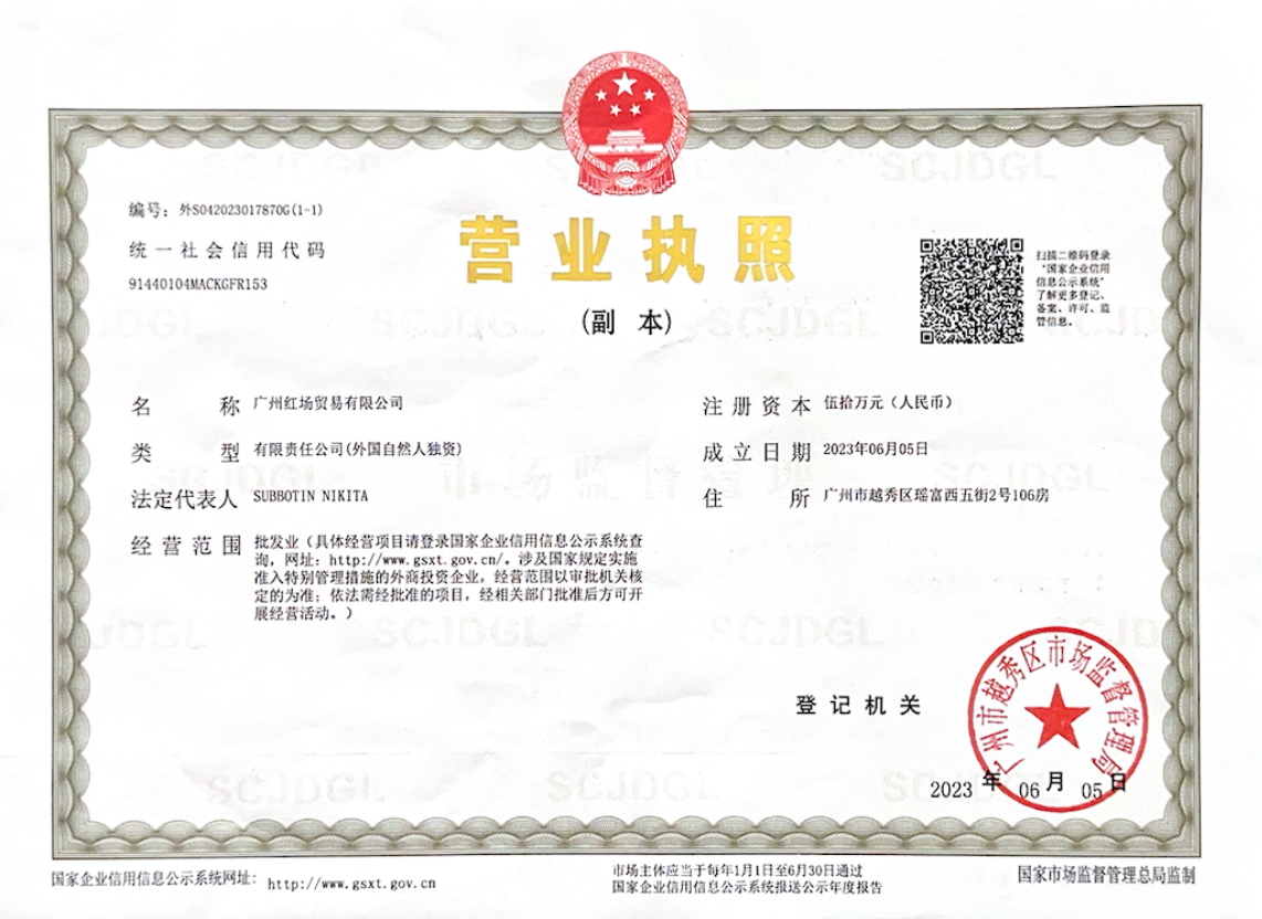 Свидетельство о регистрации компании в Китае(营业执照)