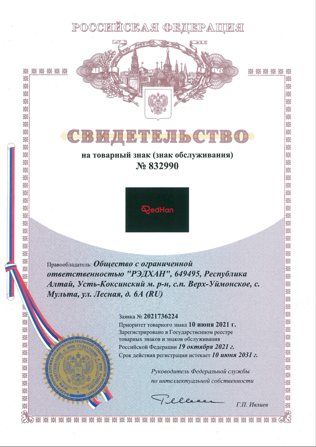 Свидетельство на товарный знак — это документ, удостоверяет факт регистрации заявленного в качестве товарного знака обозначения, приоритет товарного знака и исключительное право владельца на товарный знак в отношении товаров, указанных в свидетельстве.